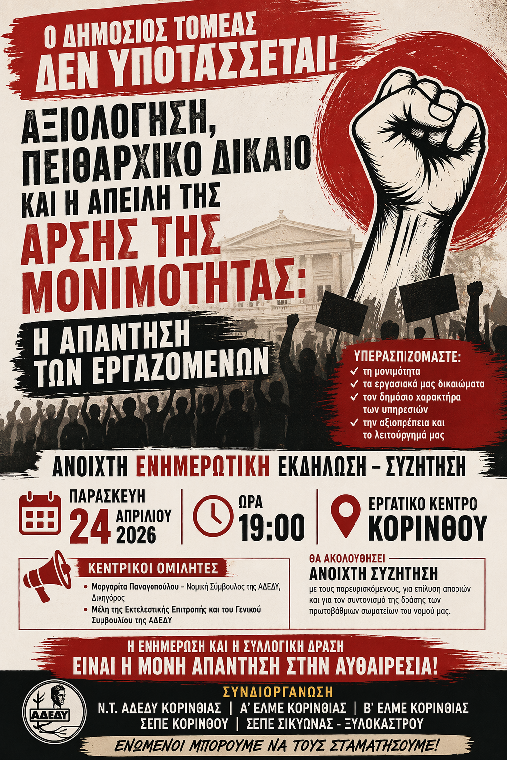 Μια κρίσιμη ανοιχτή ενημερωτική εκδήλωση-συζήτηση, με ιδιαίτερη βαρύτητα για το μέλλον των εργαζομένων στην περιοχή, πρόκειται να λάβει χώρα στην Κόρινθο. Η πρωτοβουλία, που αναλαμβάνει το Νομαρχιακό Τμήμα της ΑΔΕΔΥ Κορινθίας, επικεντρώνεται σε καίρια ζητήματα όπως η εισαγωγή και η εφαρμογή συστημάτων αξιολόγησης, οι εξελίξεις στον τομέα του πειθαρχικού δικαίου και, κυρίως, η υφιστάμενη και μελλοντική απειλή της άρσης της μονιμότητας για πολλούς εργαζόμενους του δημοσίου τομέα. Η εκδήλωση αυτή σηματοδοτεί μια προσπάθεια συλλογικής κατανόησης των προκλήσεων και διαμόρφωσης ενός συντονισμένου σχεδίου δράσης, ανταποκρινόμενη στις ανησυχίες και τα αιτήματα των δημοσίων υπαλλήλων απέναντι σε αυτές τις εξελίξεις. Η σημασία της εκδήλωσης έγκειται στην ανάγκη για ενιαία στάση και αποτελεσματική εκπροσώπηση των εργαζομένων. Η εκδήλωση συνδιοργανώνεται με τη συμμετοχή σημαντικών εκπαιδευτικών και συνδικαλιστικών φορέων της περιοχής, ενισχύοντας τον χαρακτήρα της ως αντιπροσωπευτικό βήμα.