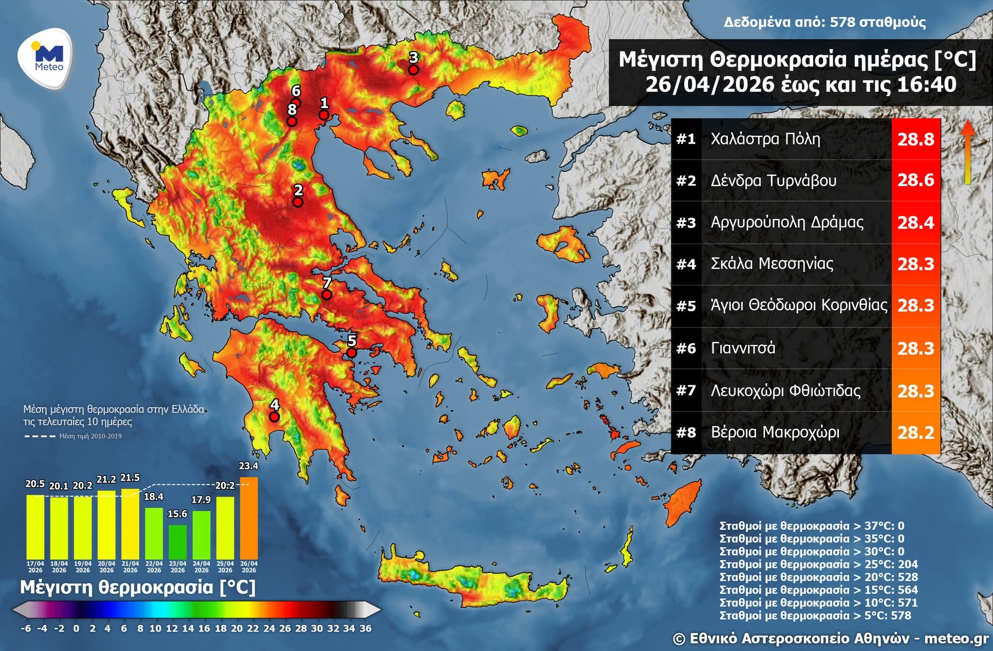 Η Κορινθία έχει αρχίσει ήδη να απολαμβάνει τους καρπούς της ανοιξιάτικης ζέστης, με τις θερμοκρασίες να ανεβαίνουν σταθερά και να ξεπερνούν το όριο των 28 βαθμών Κελσίου, δημιουργώντας μια ατμόσφαιρα που προγεύεται το επερχόμενο καλοκαίρι. Το Σαββατοκύριακο που μας πέρασε, η εθνική μας μετεωρολογική υπηρεσία κατέγραψε ιδιαίτερα υψηλές τιμές σε διάφορα σημεία της χώρας, με τις υψηλότερες να εντοπίζονται στην περιοχή των Αγίων Θεοδώρων Κορινθίας, όπου το θερμόμετρο έδειξε 28.3°C. Αυτή η ζεστή εισβολή στην αρχή της άνοιξης σηματοδοτεί μια ευχάριστη αλλαγή από τον χειμώνα που αφήνουμε πίσω, και προκαλεί ιδιαίτερη αισιοδοξία για τη συνέχεια της σεζόν. Συνολικά, η χώρα μας βίωσε μια αξιοσημείωτη αύξηση της θερμοκρασίας, η οποία προσέγγισε τους 29 βαθμούς Κελσίου την Κυριακή 26 Απριλίου. Η μετεωρολογική υπηρεσία σημείωσε τις μέγιστες τιμές σε διάφορους σταθμούς, με τη Χαλάστρα να πρωτοστατεί με 28.8°C, ακολουθούμενη από τον Τύρναβο (Δένδρα) με 28.6°C και την Αργυρούπολη Δράμας με 28.4°C.